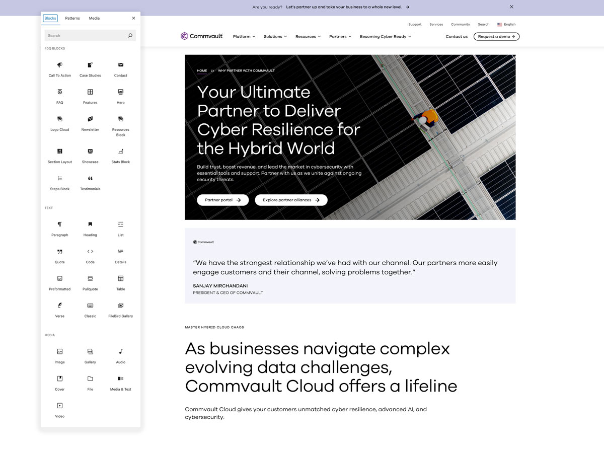 We developed a comprehensive block library tailored to Commvault’s brand guidelines. Marketing can now create any page layout, landing pages, campaigns, product pages, without writing code or waiting on developers.